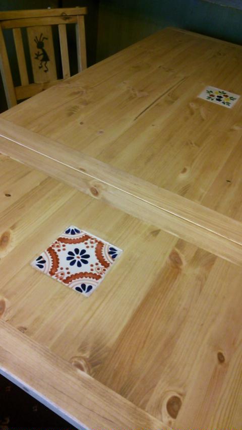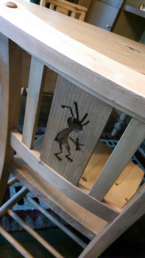 メキシカンタイルをはめ込んだり、椅子の背中をココペリの形にくりぬいたり。