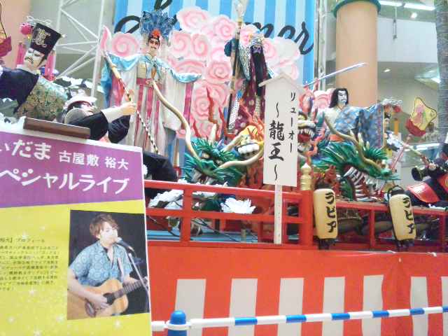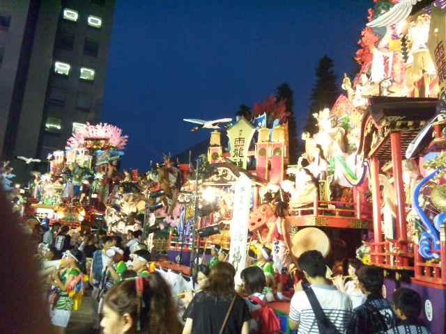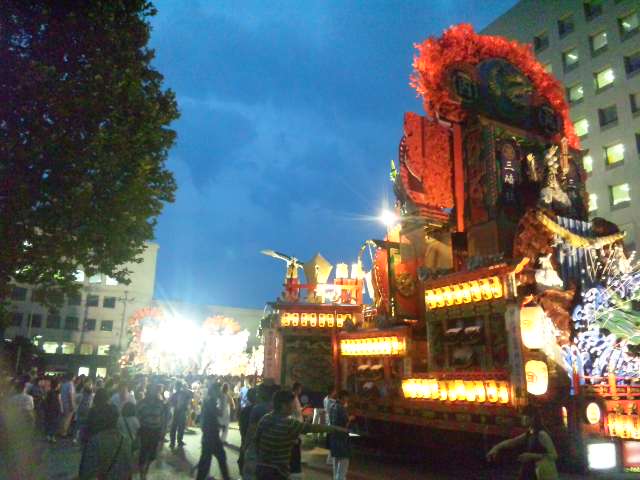 昨夜は前夜祭という事で、こういう山車が集まる所の近くで演奏しました。