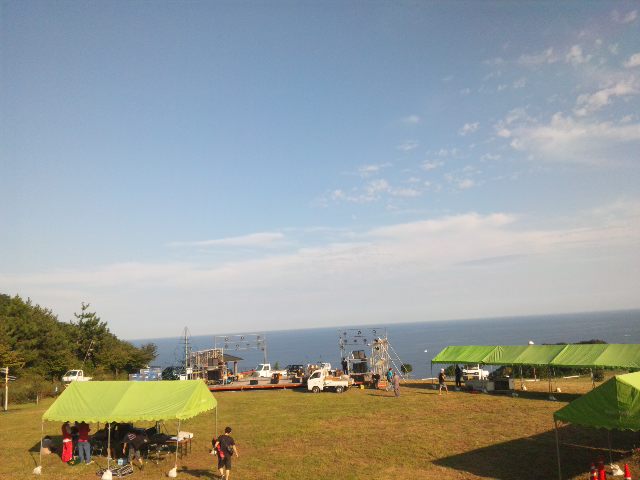 写真は前日の昼、ステージ設営時のものと夕方の会場からの景色。