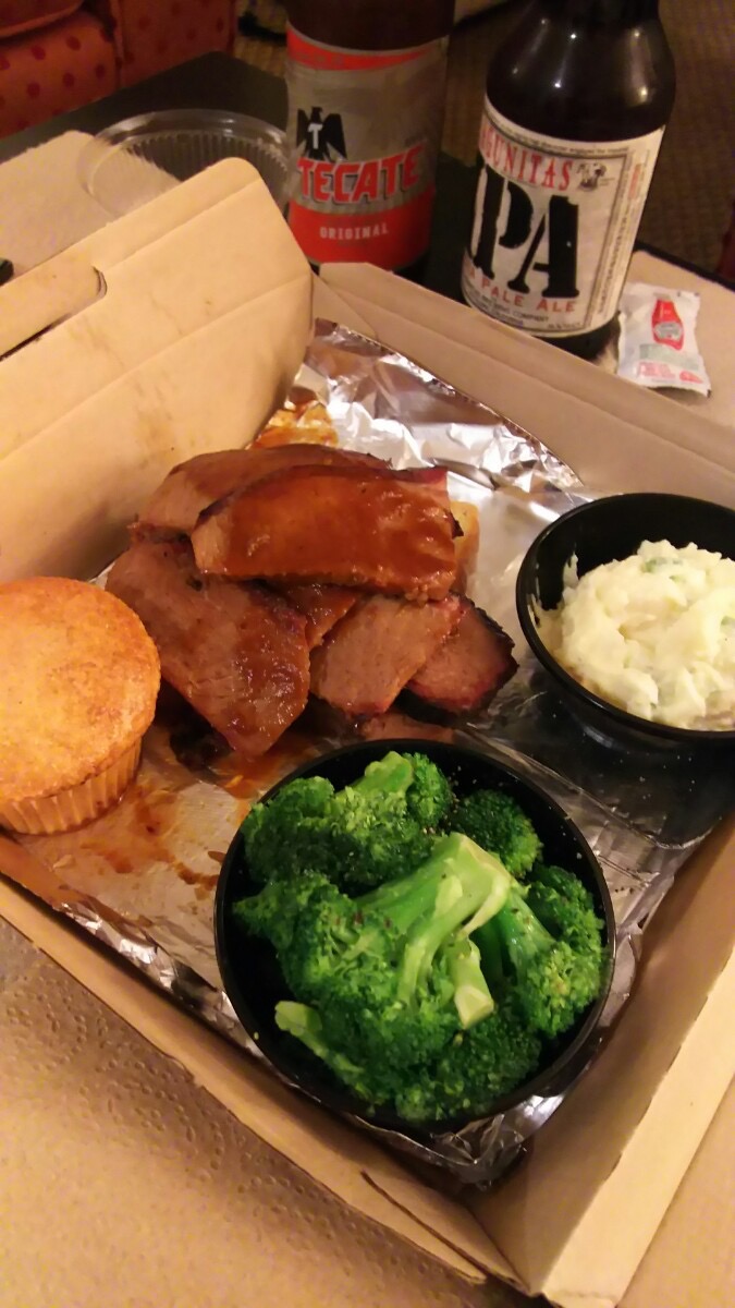 夕食は近くのBBQレストランから持ち帰って部屋でゆっくり。