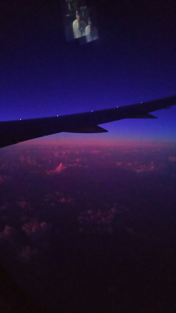 23日の午後5時に成田を出て、やく8時間。外は23日、アメリカ上空の夜明け前。