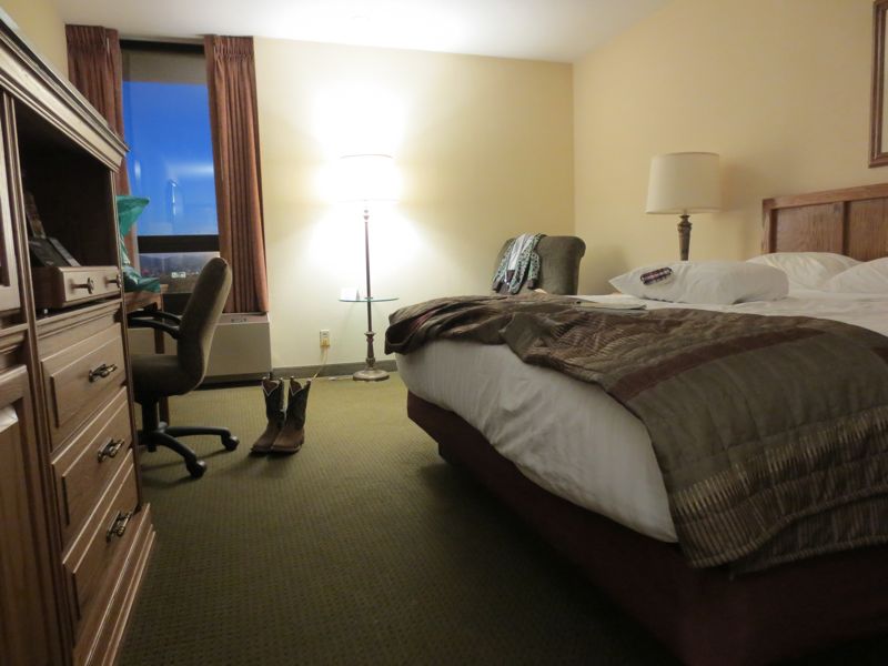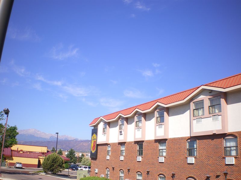 今夜の宿はここ、スーパー8モーテル。遠くにロッキーの山々が見えます。