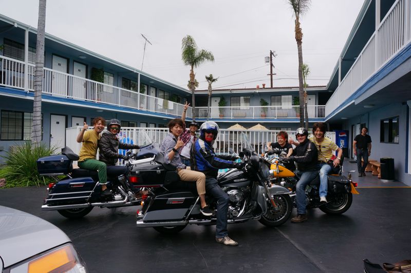 ホテルのパティオのプール前で陽気なバイクおじさんグループと遭遇。
